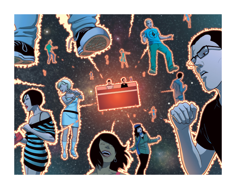 La segunda miniserie, The Singles Club, difiere del primer volumen en el hecho de que más que narrar una historia continua entre todos los números, lo que hace es narrar un solo momento desde la perspectiva de diferentes personajes. Algo que ya se ha visto antes, pero que se interpreta de manera magistral. Todo ocurre en una noche en un club de música indie en el cual habrá un evento llamado “Never on a Sunday” (Nunca en Domingo) en el cual hay tres reglas: toda la música debe ser por intérpretes femeninas, todos deben bailar, y no se permite la magia. Ahí se reúnen toda una serie de personajes muy peculiares y cada una vive el mismo evento a su manera. En el #1 vemos la perspectiva de Penny B., una chica muy dulce, de esas que todos aman o aman odiar, de esas chicas que todo obtienen con una sonrisa pero que no tratan de aprovecharse de ello, más bien ve la vida de manera muy simple. En el segundo número vemos el mismo evento desde la perspectiva de Marquis, el chico del cual Penny está enamorado pero que no le corresponde pues tiene sus propias preocupaciones. El #3 nos muestra a los anfitriones, Seth Bingo y la chica silenciosa. El #4 es desde la perspectiva de Emily Aster, una chica que logró exiliar a su yo anterior a una especie de limbo, pero no pude verse al espejo sin toparse con ella. El #5 está dedicado a Laura Heaven, una chica que se define a si misma como una mala persona y que pasa toda la noche con citas y referencias a canciones de The Long Blondes. El #6 corresponde a David Khol y rompe y poco con la esencia de la serie, ya que aunque sigue haciendo referencia a la misma noche, los eventos ahí narrados son posteriores a la fiesta, y no durante ella. Y la serie termina en un genial #7 donde las acciones hablan más que las palabras.